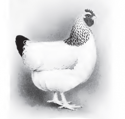 Plumage of the Hen: Head white. Neck hackles white striped with black. Back: dark grey to black with each feather showing the distinctive birchen patterning of white shafting and lacing. The remainder of the body plumage to be similar to that of the male.